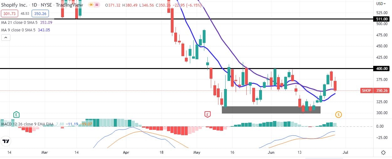 Update: Shopify Inc. (NYSE: SHOP) extended its losing streak into the third straight day on Wednesday, resuming its correction from over one-week highs of $39.50. The stock price of SHOP slid 5.64% to end the day at $33.05, having hit a new five-day low of $32.47 earlier in the session. The share price of the Canadian e-commerce giant slipped after the completion of a 10-for-1 split of its common stock on Wednesday. The share split “will make ownership more accessible to all investors,” the company said in a statement before the stock split. SHOP has eroded roughly 75% of its value so far this year as e-commerce traffic slows and investors flee growth stocks, in the face of rising borrowing costs.