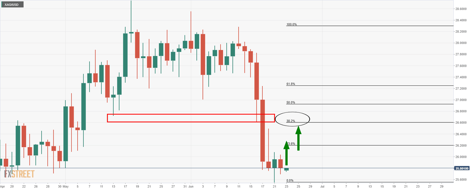 - Silver is firming at critical support and bulls look to the 38.2% Fibo and prior structure.