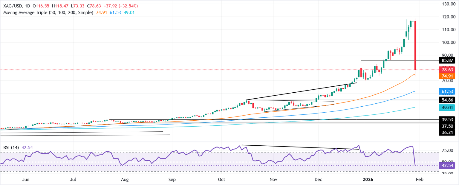Silver (XAG/USD) sinks sharply by more than 30% on Friday as the precious metals segment is being punished by the financial markets, with the grey metal falling more than $38 at the time of writing. XAG/USD trades at $76.91, after reaching a daily high of $118.46.