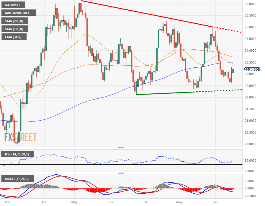 Any nasty surprises from the economic calendar this week could see the XAG/USD stumble, but overall market momentum is leaning firmly bullish with Silver set to make a hard run at the 200-day Simple Moving Average (SMA) currently treading water near $23.50.