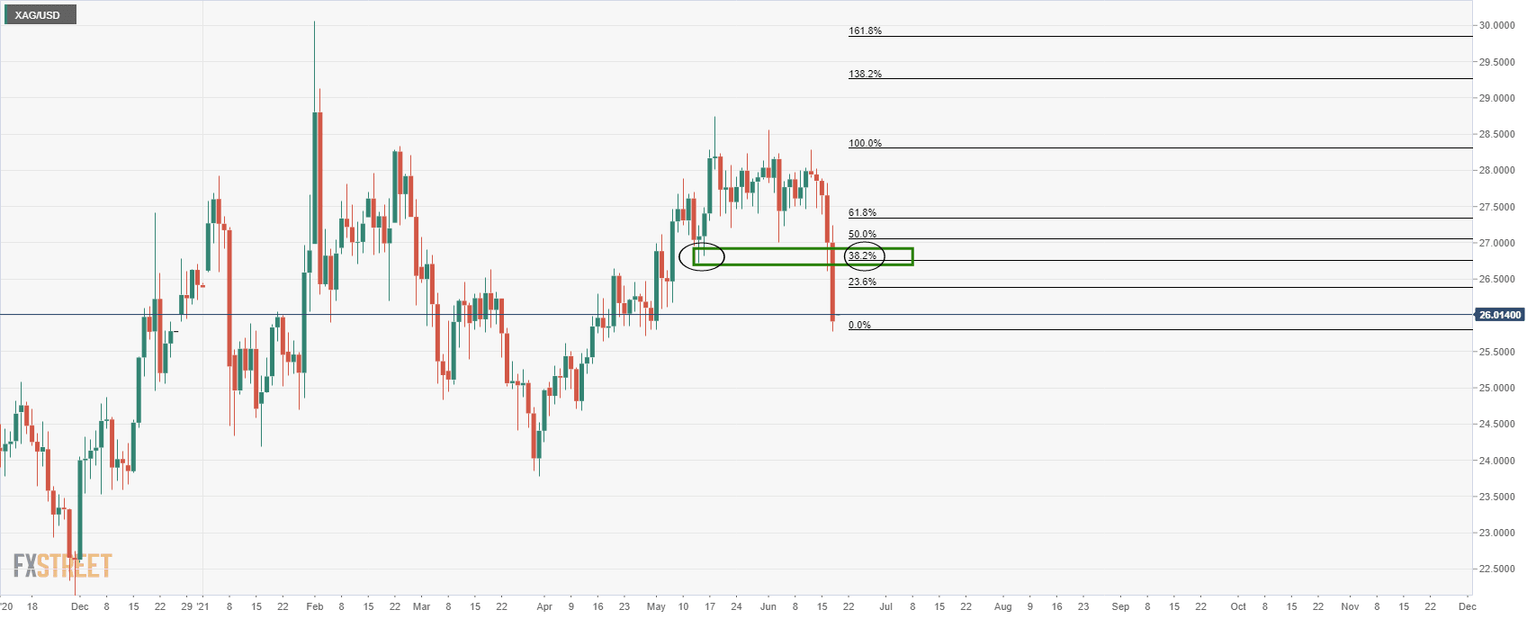 Bulls are looking to take silver into liquidity around the $26.78 mark where the 38.2% Fibo of the daily bearish impulse is located.