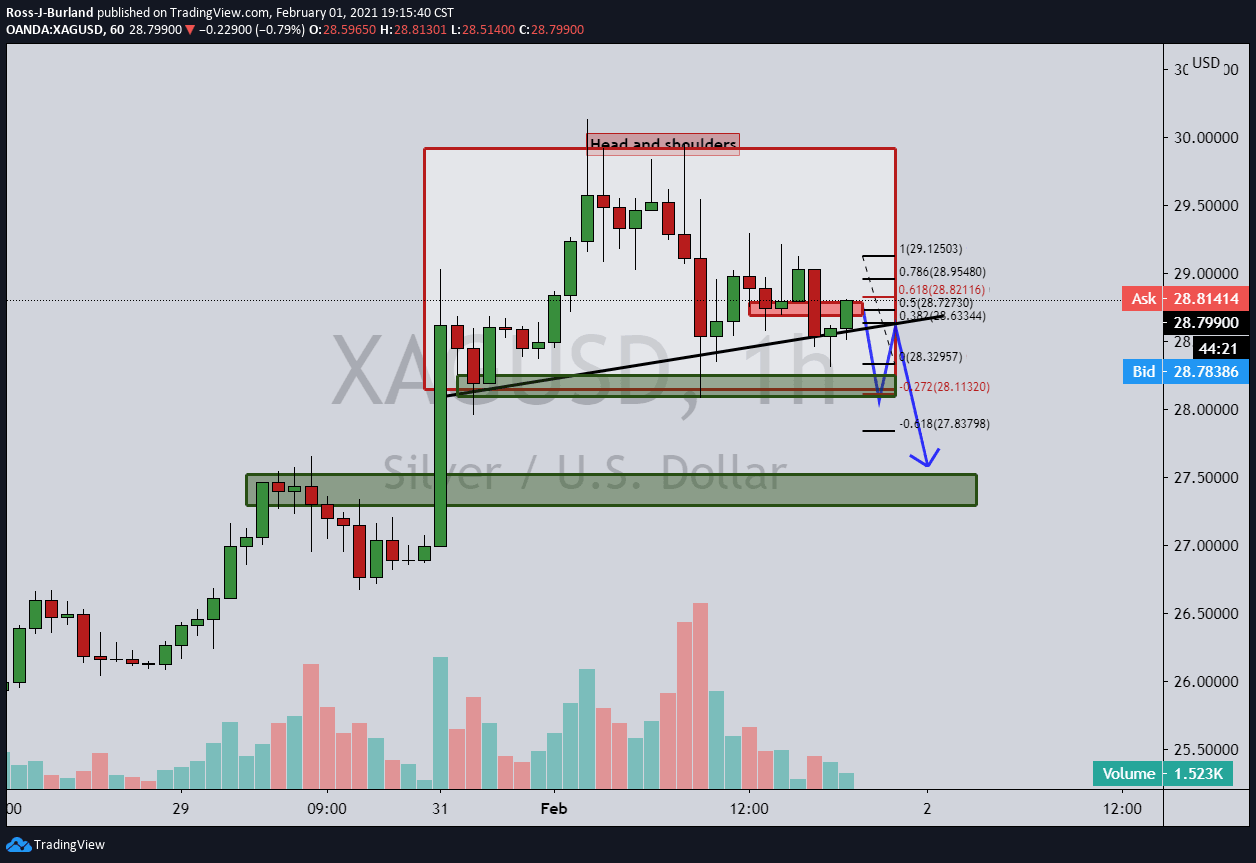 - XAG/USD on the verge of a break of the H&S neckline.