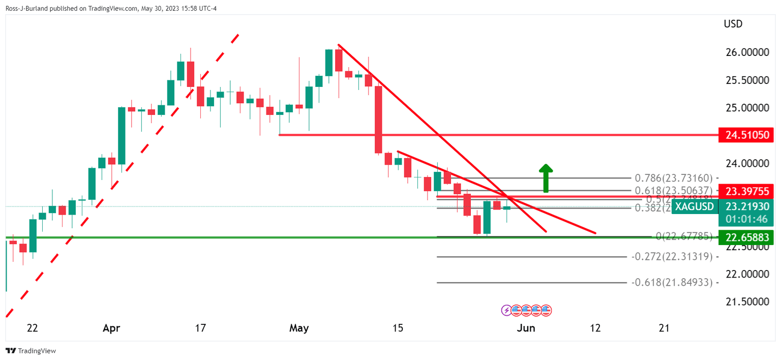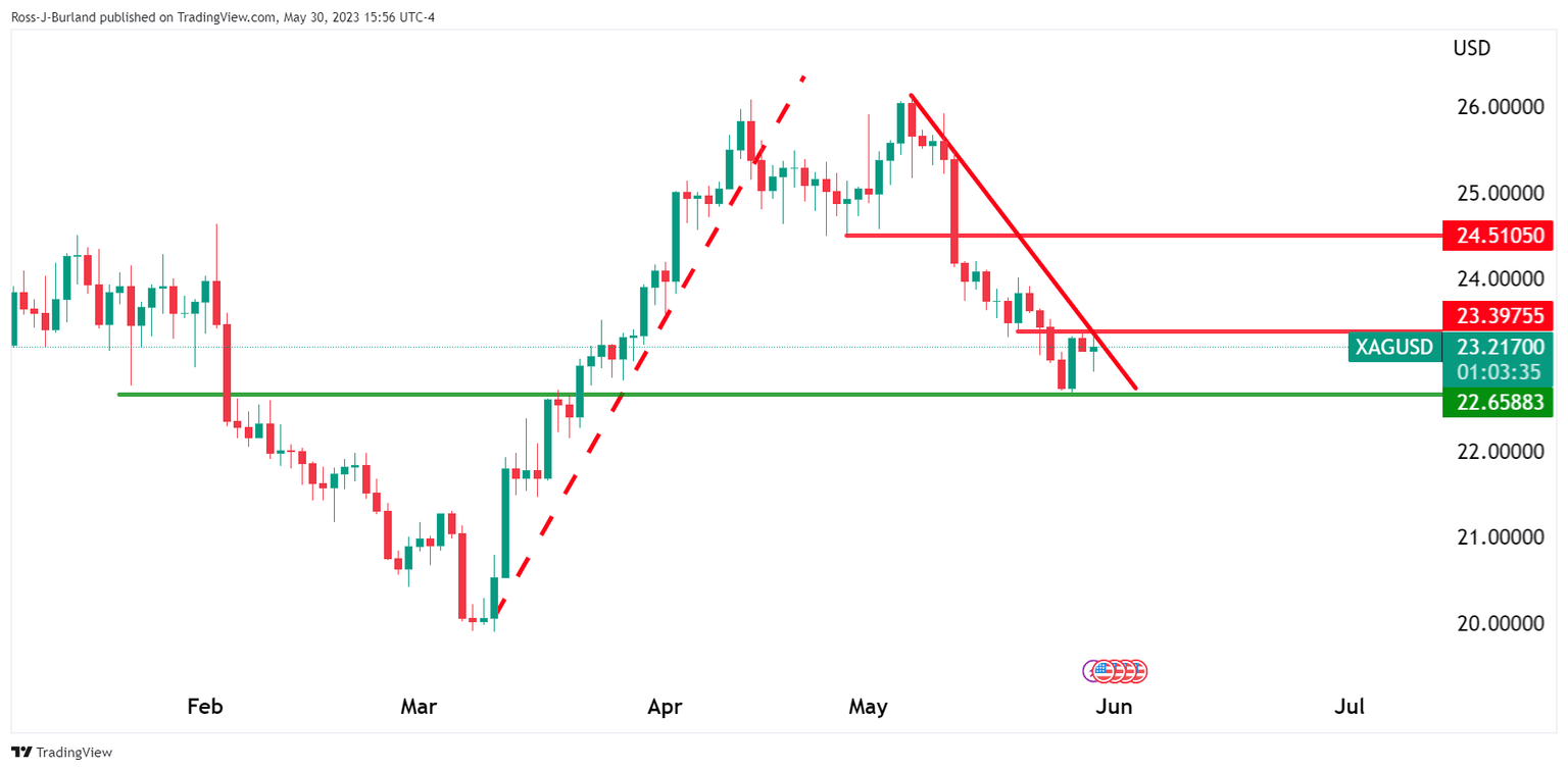 Silver Price Analysis: Bears go head to head with bulls near trend line resistance