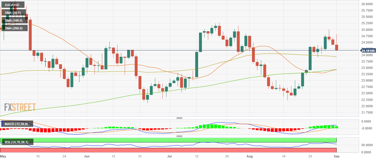 - XAG/USD peaked at a daily high of $24.80 then settled near the $24.15 area.