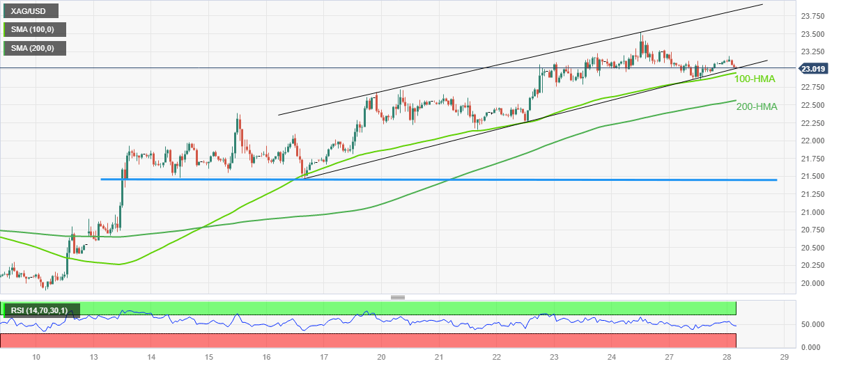 Should the quote breaks the $23.00 support, also remain comfortably below the 100-HMA support surrounding $22.95, then the XAG/USD bears could challenge the last defense of the buyers, namely the 200-HMA level of $22.55.