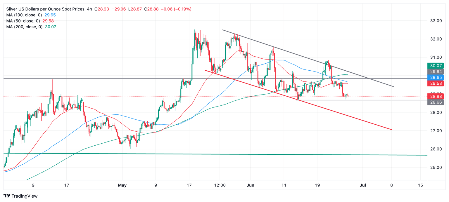 Silver rallied strongly on June 20 and 21 but then failed to break out of the top of its falling channel. It then fell back down, finding support at $28.66, the June 13 lows, from where it has just bounced.