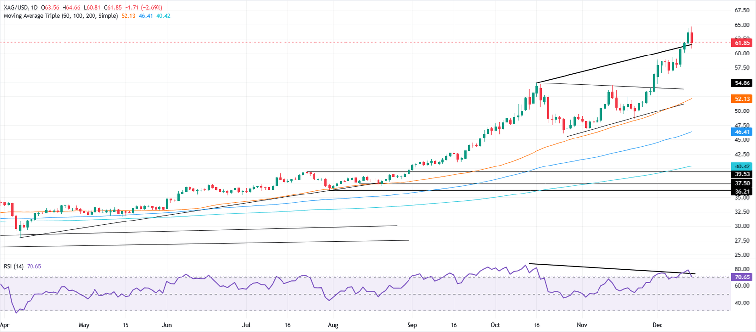 - Silver drops 2.75% to $61.84 after printing a fresh all-time high at $64.65.