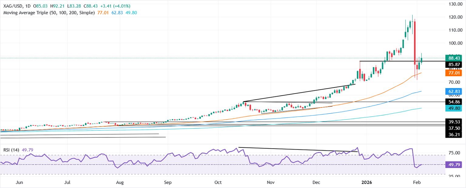 - Silver extends recovery to $88.20, shrugging off broad US Dollar strength after solid economic data.