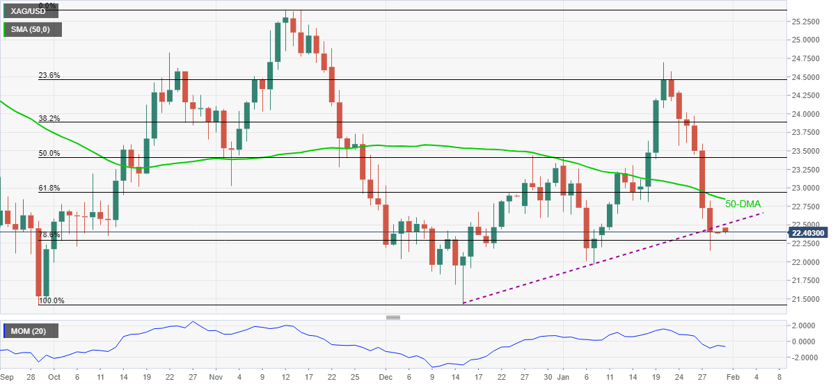 Silver (XAG/USD) remains on the back foot around $22.40, down 0.10% intraday during Monday’s Asian session.