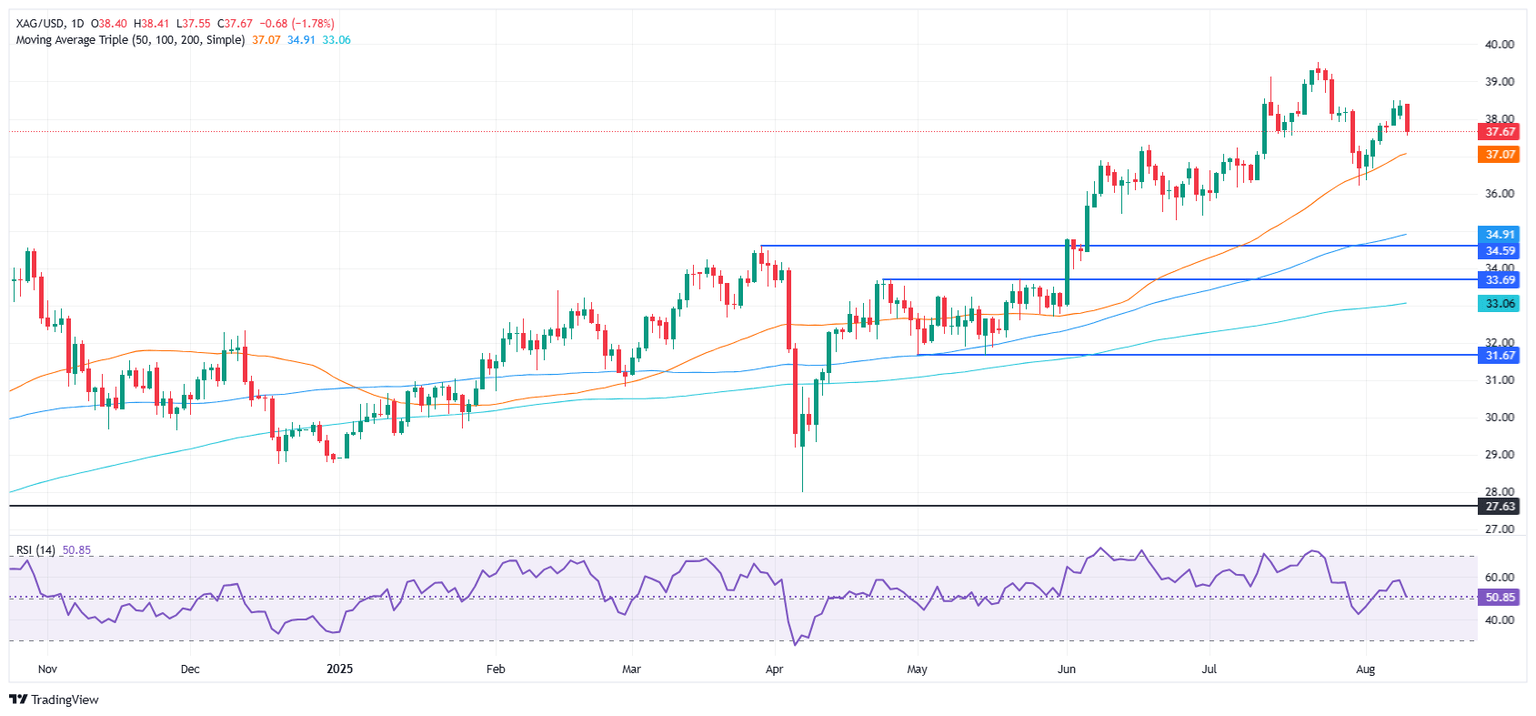 After posting a rally for five days, Silver faced its first red candle on Monday, which dragged the spot price below $38.00. Despite the pullback, the Relative Strength Index (RSI) shows that buyers are in charge, as the index remains bullish.