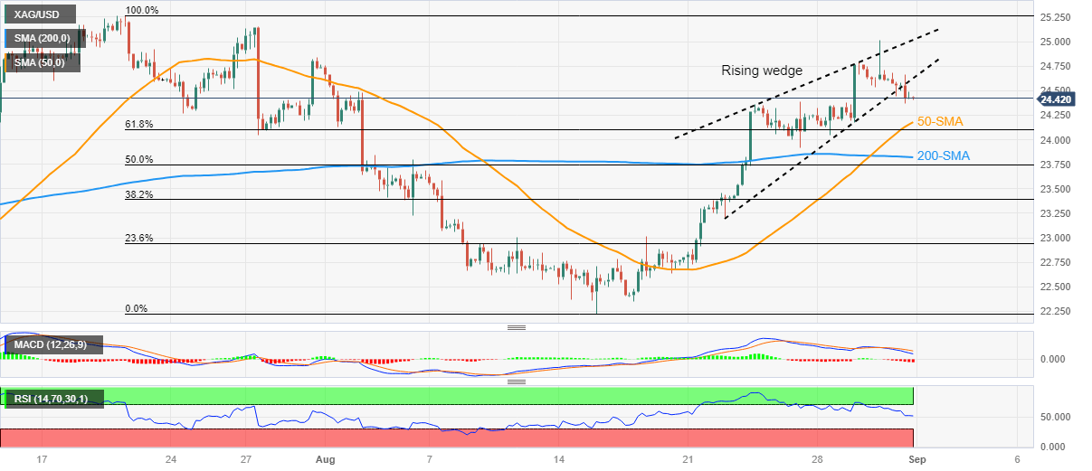 However, bearish MACD signals and the downbeat RSI (14) line, not overbought, join the confirmation of a one-week-old rising wedge bearish chart formation to keep the XAG/USD sellers hopeful.