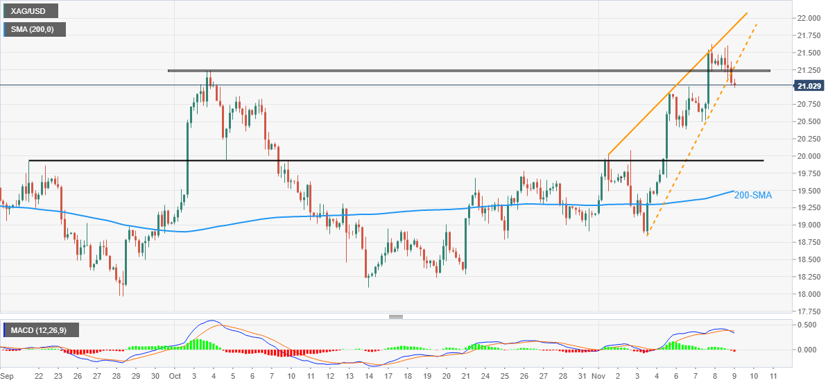 Silver Price Analysis: Rising wedge confirmation favors XAGUSD bears near $21.00