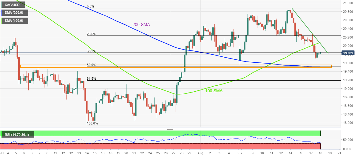 On the contrary, multiple levels marked since early July joins the 200-SMA and 50% Fibonacci retracement level to highlight $19.50 as strong support. Following that, $18.90 and July’s low of $18.14 could lure the bullion bears.
