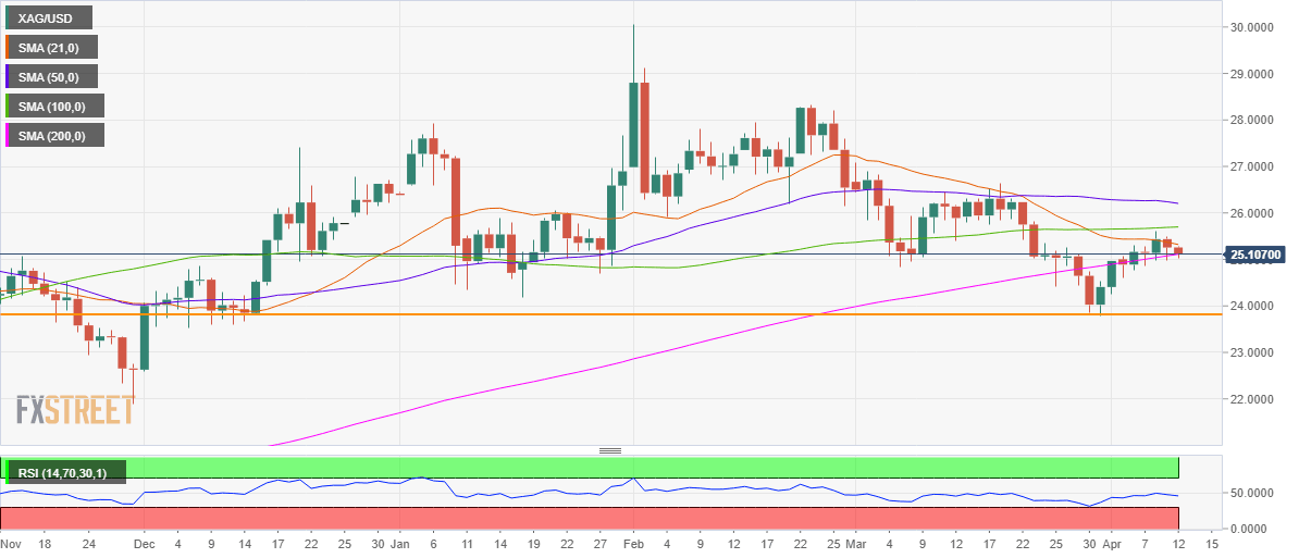 Silver (XAG/USD) is battling the critical 200-daily moving average (DMA) support at $25.11, as sellers look for an entry, in a bid to test the $24 mark.