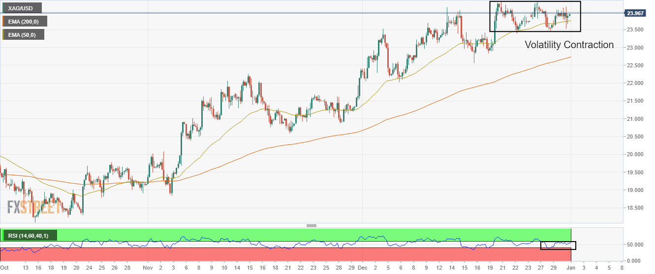 Meanwhile, the 50-period Exponential Moving Average (EMA) at $23.77 is overlapping with the Silver price, which indicates a consolidation on a short-term basis.