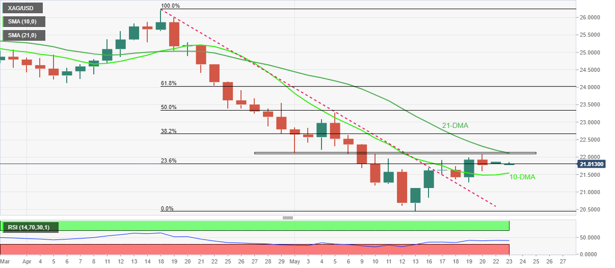 Silver (XAG/USD) picks up bids to $21.85 as buyers reverse the week-start pullback, justifying the previous week’s breakout of crucial hurdles. Also keeping the metal buyers hopeful is the gradual recovery in the RSI as prices rebound during Monday’s Asian session.