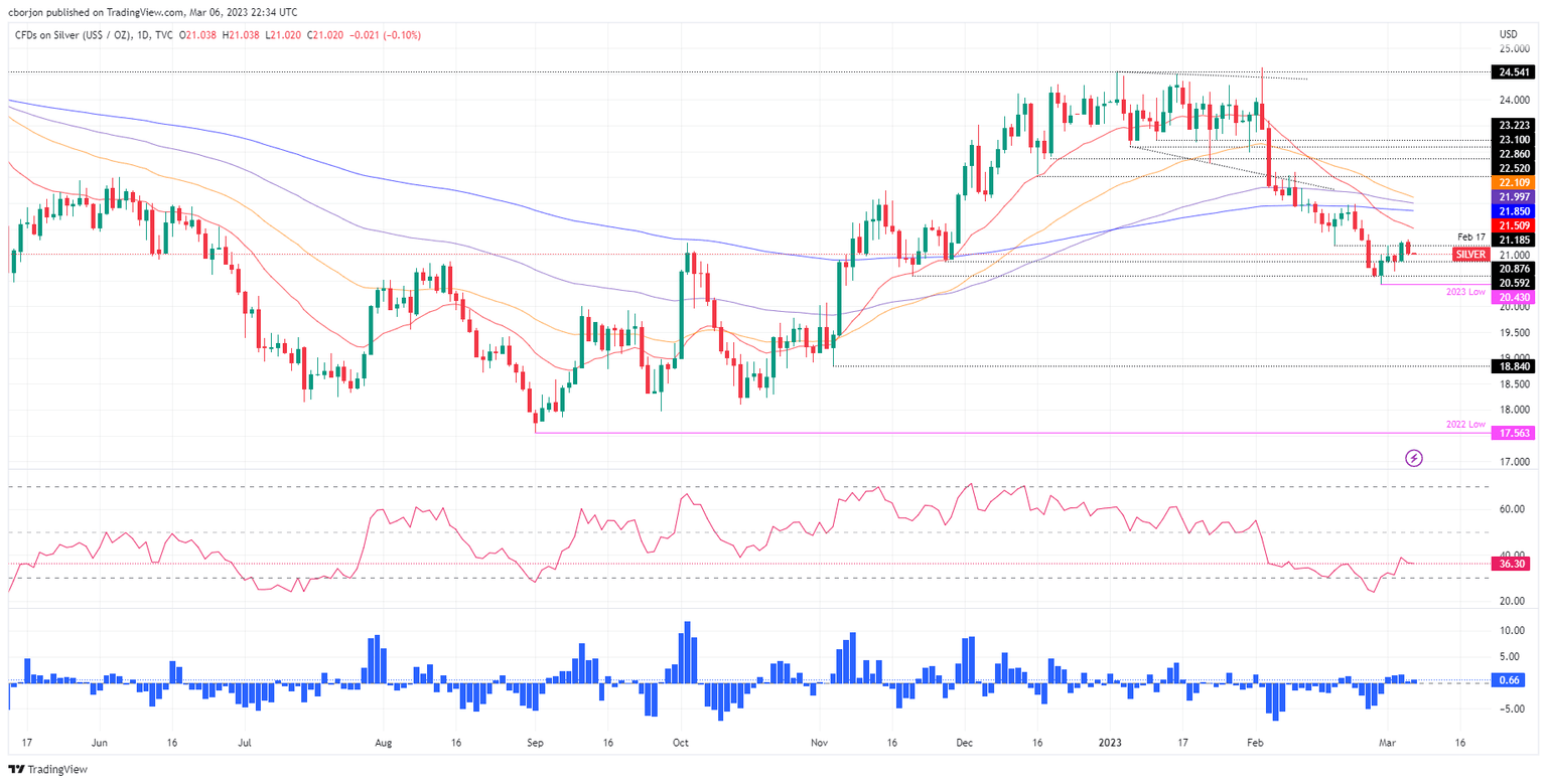 Silver is downward biased, as shown by the daily chart. After testing the February 17 daily low, which turned resistance at $21.18, the XAG/USD spot price dropped, as bears eye $20.00. However, on its way south, the XAG/USD needs to clear the $21.00 barrier. Once removed, the XAG/USD next support would be the March 3 low of $20.84, followed by the March 1 low of $20.68. A breach of the latter would expose the YTD low of $20.43.