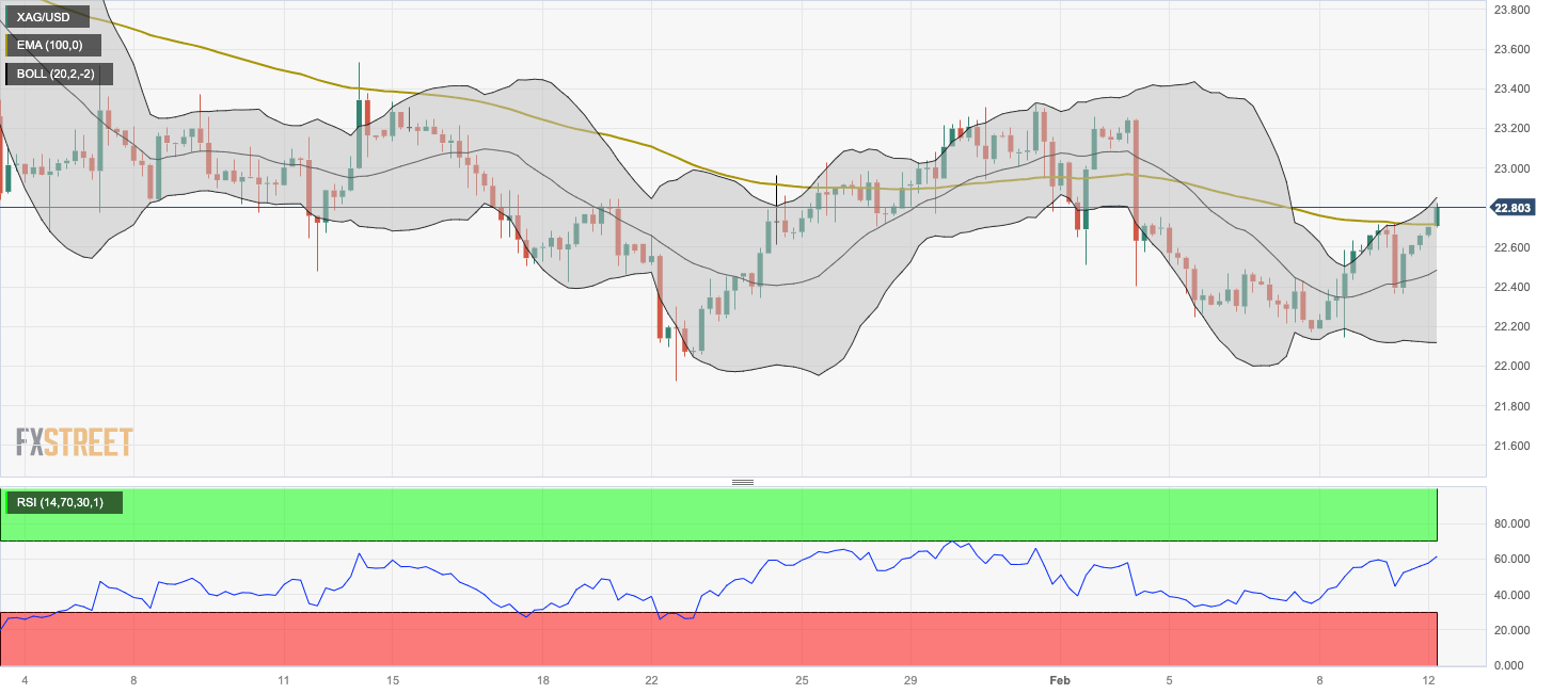 On the downside, the 100-period EMA at 22.70 acts as an initial support level for the metal. A break below the latter will see a drop to a high of February 6 at 22.48. The next downside target is seen near the lower limit of the Bollinger Band at 22.10 and a low of January 22 at 21.92.