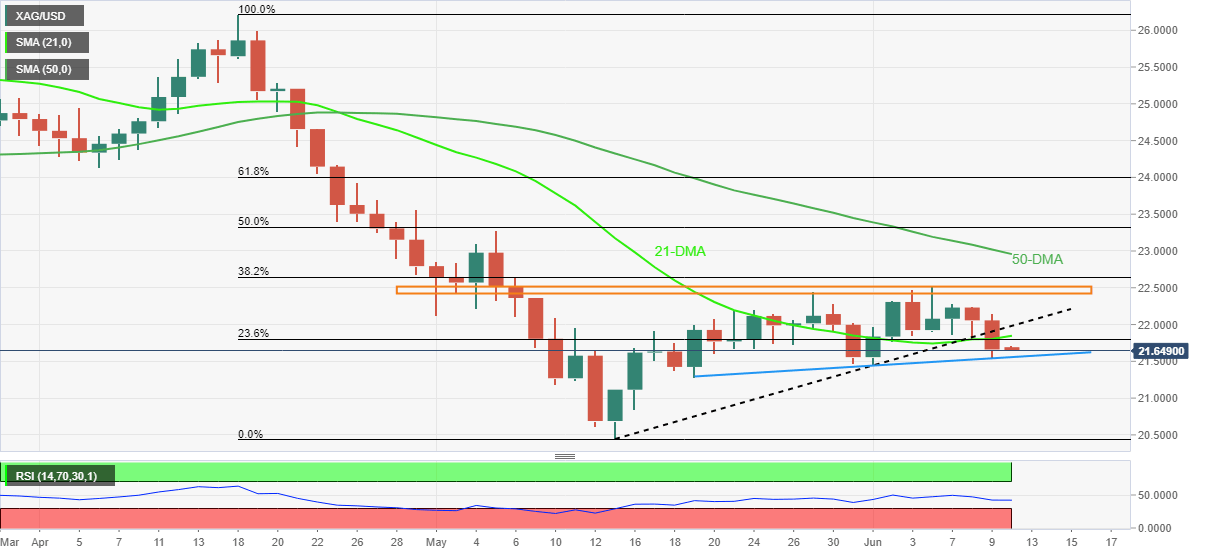 Meanwhile, recovery moves may initially be challenged by the 21-DMA and the support-turned-resistance line from early May, respectively around $21.85 and $22.00.