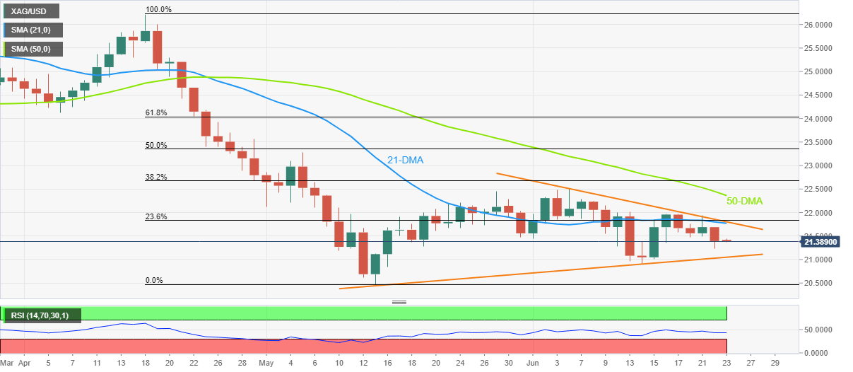 Silver (XAG/USD) stays on the back foot for the second consecutive day, taking offers at around $21.35, during Thursday‘s Asian session.