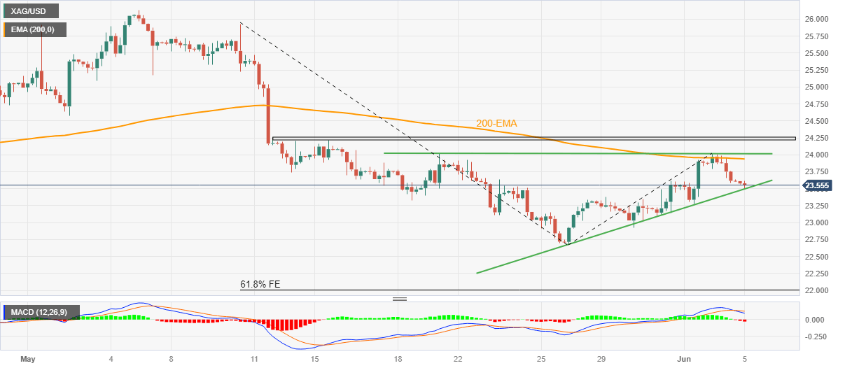 Silver Price (XAG/USD) stays depressed around the intraday low of $23.50 heading into Monday’s European session. In doing so, the bright metal prods the bottom line of a two-week-old ascending triangle while extending the previous day’s pullback from the 200-bar Exponential Moving Average (EMA).