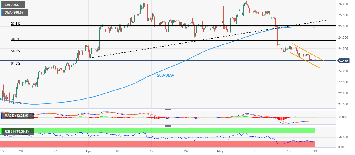 On the contrary, a convergence of the aforementioned falling channel from Monday and the 61.8% Fibonacci retracement level of the pair’s April-May upside, around $23.25, put a floor under the Silver price.