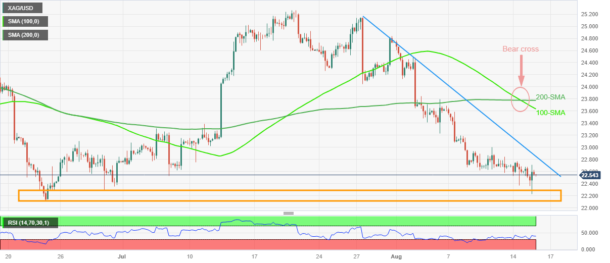 Silver Price (XAG/USD) remains pressured at the lowest level in seven weeks despite making rounds to $22.50 during the early Asian session on Wednesday. In doing so, the bright metal fades the previous day’s corrective bounce off the key support zone amid the market’s broad risk-off mood and the firmer US Dollar and the Federal Reserve (Fed) monetary policy meeting minutes.