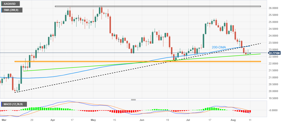 - Convergence of 200-DMA, resistance-turned-support from early March join bearish MACD signal to prod XAG/USD bulls.