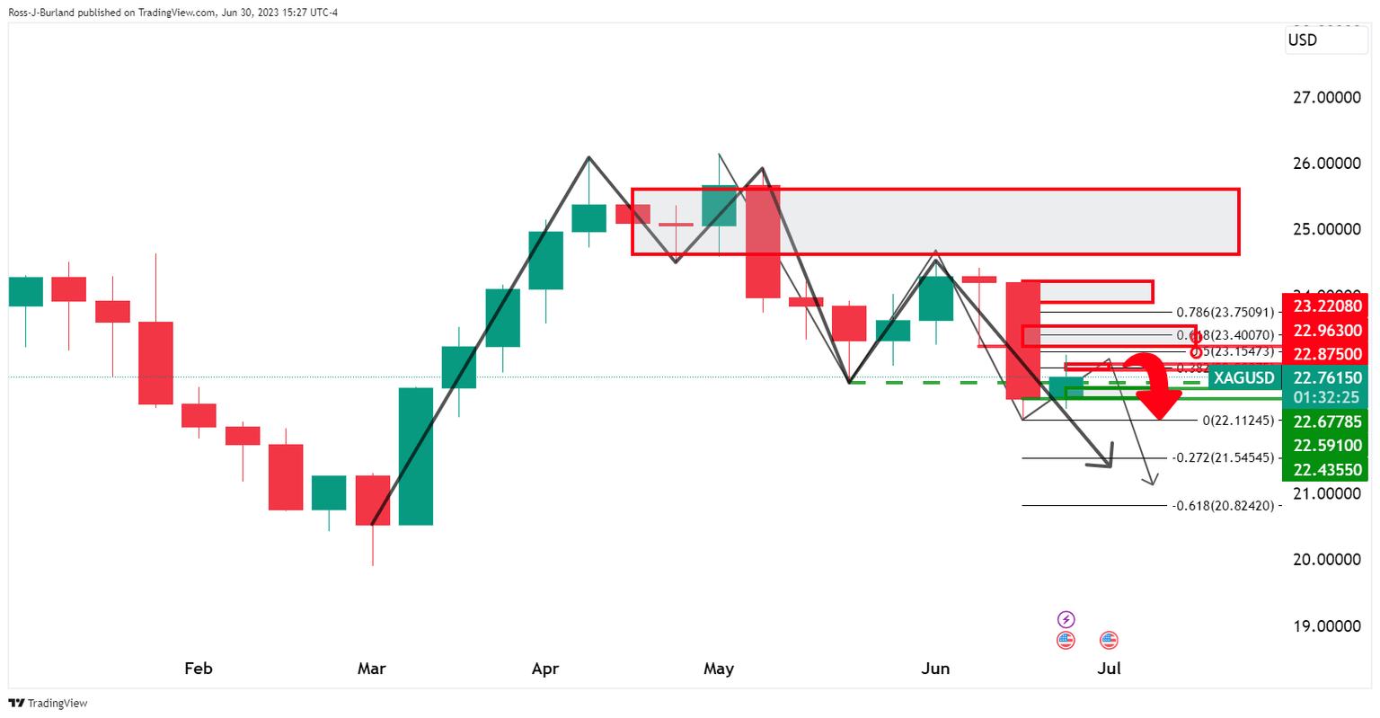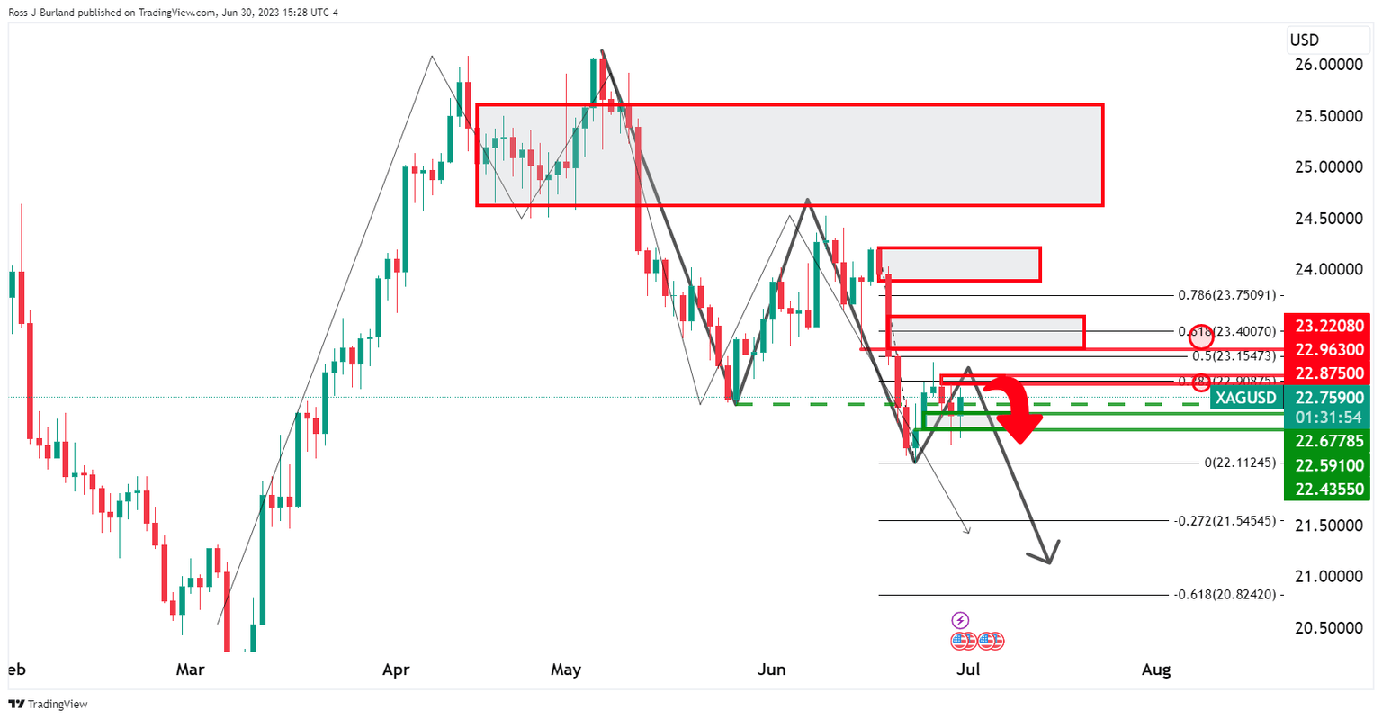 Silver shot up in a correction on Friday with a high of $22.844 from $22.3474 the low. The bulls are correcting the week's sell-off into month's end. The focus is on the Federal Reserve as data continues to offer mixed messages. The Federal Reserve's preferred inflation gauge rose 0.3% MoM, in line with forecasts and below 0.4% in April while the annual core rate slowed to 4.6% and the headline PCE rate reached the lowest in nearly two years.