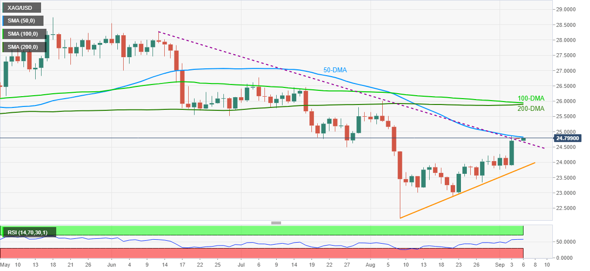 Silver Price Analysis: XAG/USD bulls attack 50-DMA on the way to $25.00