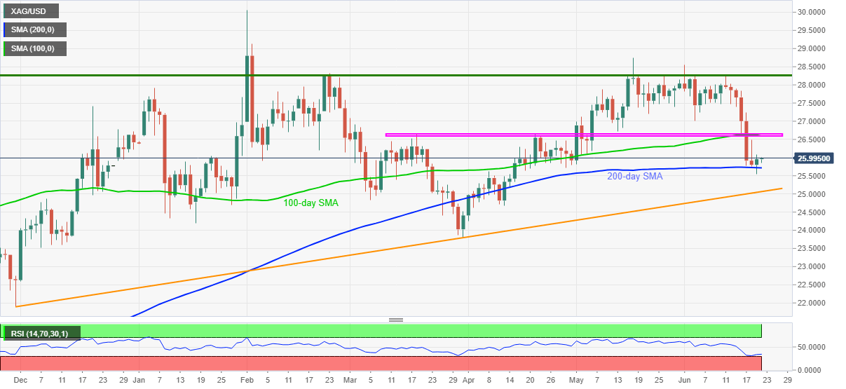 Silver buyers attack the $26.00 threshold, up 0.13% intraday, ahead of Tuesday’s European session. In doing so, the quote keeps the previous day’s bounce off 200-day SMA amid RSI recovery from oversold conditions.