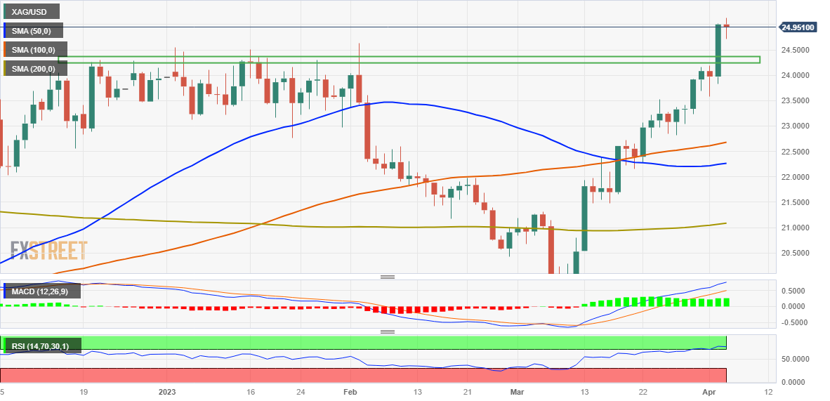 From a technical perspective, the overnight sustained move and acceptance above the $24.30-$24.40 strong horizontal barrier was seen as a fresh trigger for the XAG/USD bulls. A subsequent strength beyond the previous YTD peak, around the $24.65 zone, might have already set the stage for an extension of the recent strong upward trajectory witnessed over the past month or so.