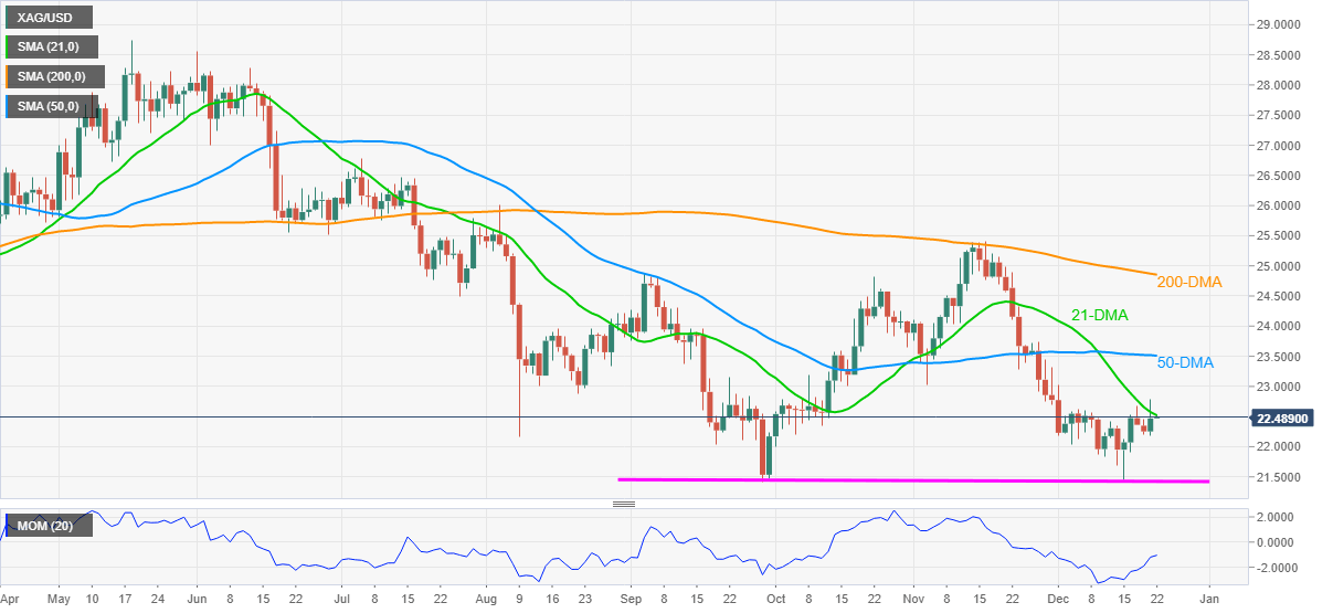 Silver (XAG/USD) keeps pullback from the monthly top, stays pressured around $22.50 during Wednesday’s Asian session. In doing so, the bright metal registers failures to cross the 21-DMA while staying above the double bottoms marked during September and December.
