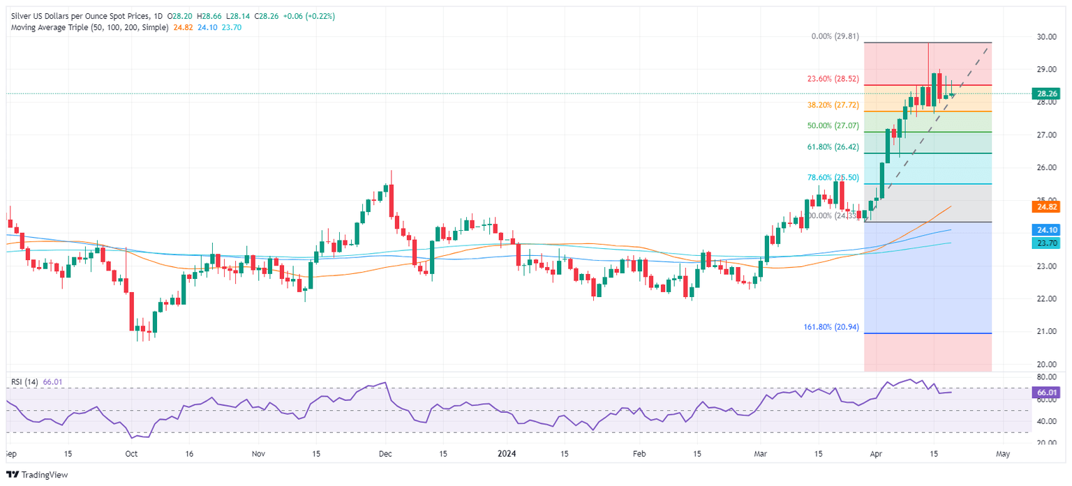 Silver clings to modest gains of 0.29% and stays above $28.00 for the sixth consecutive trading day amid higher US Treasury bond yields and a strong US Dollar. At the time of writing, the XAG/USD trades at $28.30 after hitting a daily low of $28.14.