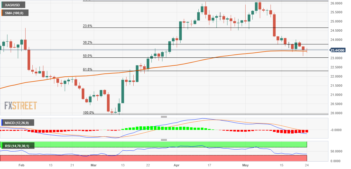 Against the backdrop of the recent failures near the $24.00 mark and the overnight slide below the technically significant 100-day Simple Moving Average (SMA) favours bearish traders. Moreover, technical indicators on the daily chart are holding deep in the negative territory and are still far from being in the oversold zone. This, in turn, suggests that the path of least resistance for the XAG/USD is to the downside and supports prospects for an extension of the retracement slide from over a one-year top, around the $26.15 region touched earlier this month.