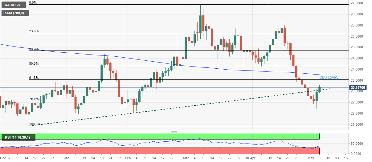 Given the RSI rebound from the nearly oversold territory also favoring the buyers, XAG/USD is up for challenging the 200-DMA level surrounding $23.75. However, 61.8% Fibo. near $23.55, will test the immediate upside momentum.