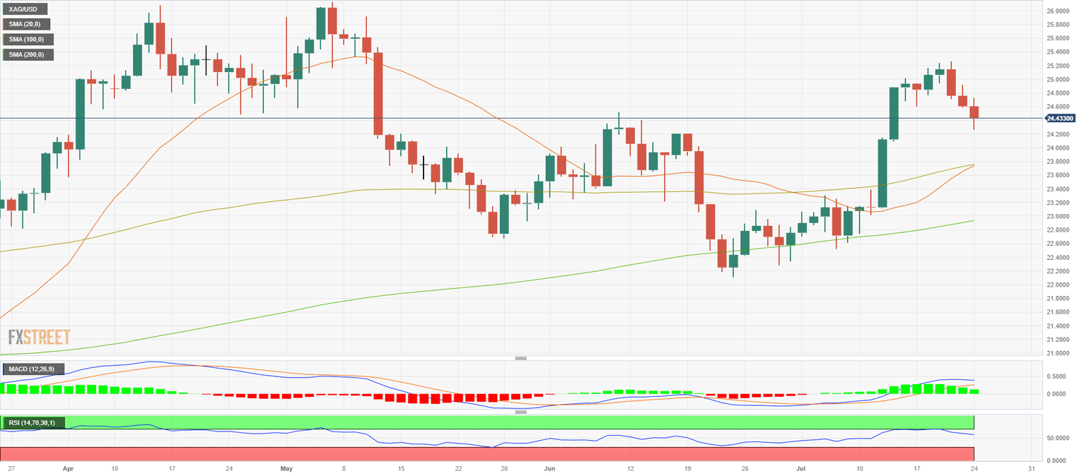- XAG/USD dropped for a third consecutive day below $24.50, bullish cross between the 20 and 100-day SMA.