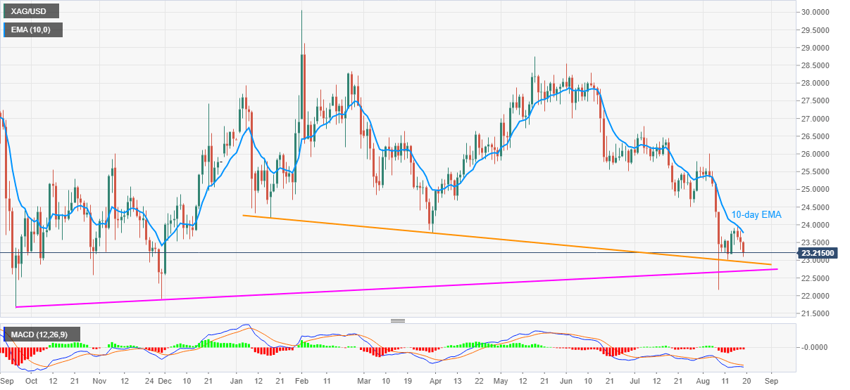 Silver (XAG/USD) drops 1.25% during early Thursday, around $23.20 by the press time. In doing so, the white metal justifies Tuesday’s pullback from 10-day EMA amid bearish MACD to refresh one-week low, not to forget declining for the third consecutive day.