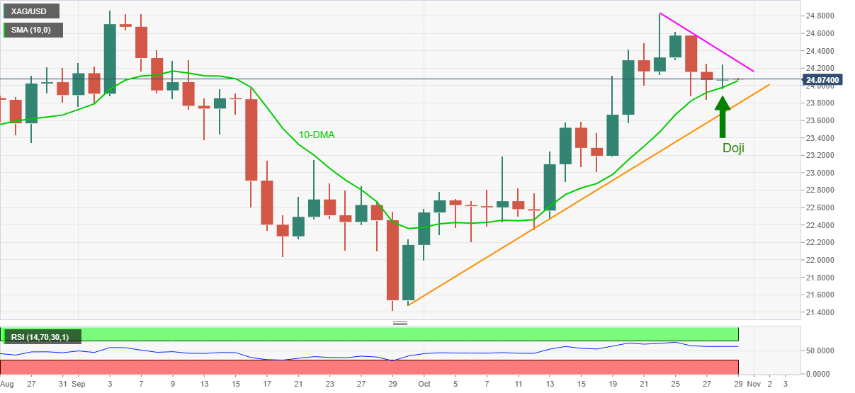 Meanwhile, 10-DMA restricts the immediate downside of the metal around $24.00, a break of which will direct silver prices toward an ascending support line from September 30, close to $23.80.
