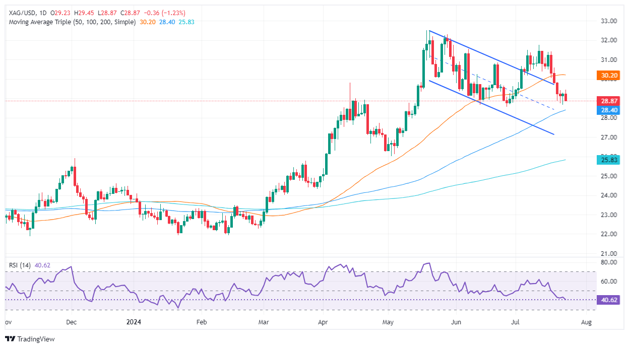 From a technical perspective, the XAG/USD dropped beneath $29.00 and is set to extend its losses past the June 26 low of $28.57. Momentum shows that sellers are in charge as the Relative Strength Index (RSI) accelerates to the downside, remaining bearish and with enough room before turning oversold.