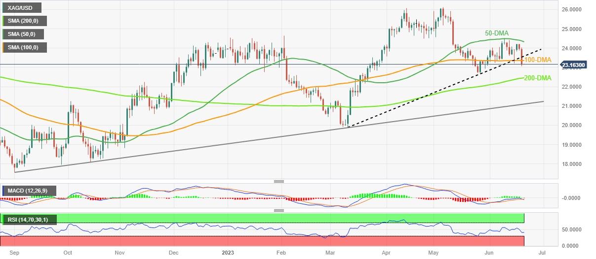 - Downside break of three-month-old support line, 100-DMA favor XAG/USD sellers.