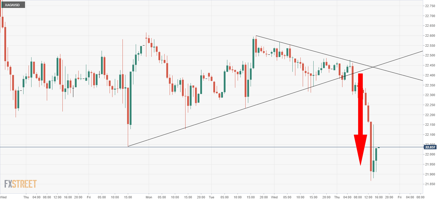 Silver Price Analysis: XAG/USD dumps to $22.00 level amid technical selling, strong US macro data
