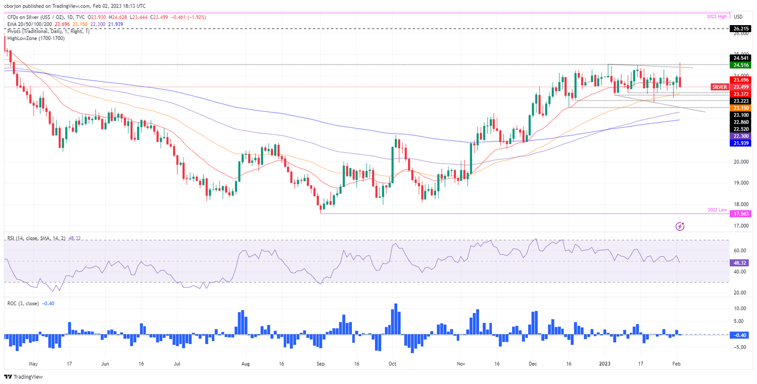 The XAG/USD is still range-bound, dropped below the 20-day Exponential Moving Average (EMA) at $23.69, which would act as a resistance level in the event of Silver attempting to rally back to $24.00. XAG/USD’s failure to decisively break the previous YTD high at $24.54 could pave the way for a re-test of $23.00, a psychological level. Once cleared, that will put in play the January 23 swing low of $22.76, followed by the December 16 daily low at $22.56.