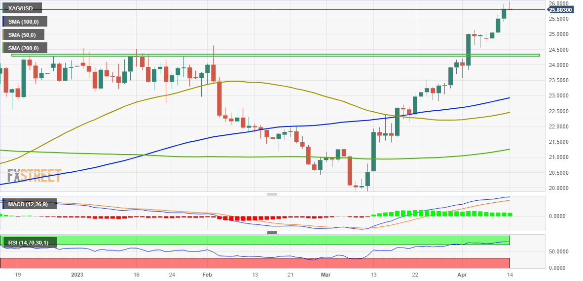Against the backdrop of a strong rally witnessed over the past month or so, the slightly overbought Relative Strength Index (RSI) on the daily chart turns out to be a key factor holding back traders from placing fresh bets around the XAG/USD. That said, the recent breakout through the $24.30-$24.40 strong horizontal barrier and a subsequent move beyond the $25.00 psychological mark support prospects for additional gains.