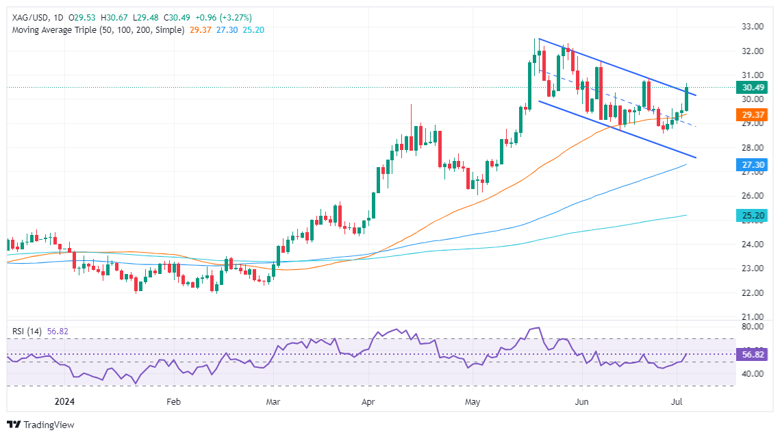 Silver price surged on Wednesday and, on its way north, cleared the key resistance trendline seen passing at around $30.00, which underpinned the grey metal to an eight-day high of $30.66. As the Asian session begins, the XAG/USD trades at $30.44, virtually unchanged.