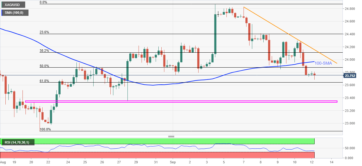 Silver (XAG/USD) drops to the lowest since August 27, recently sidelined around $23.77 during early Monday.