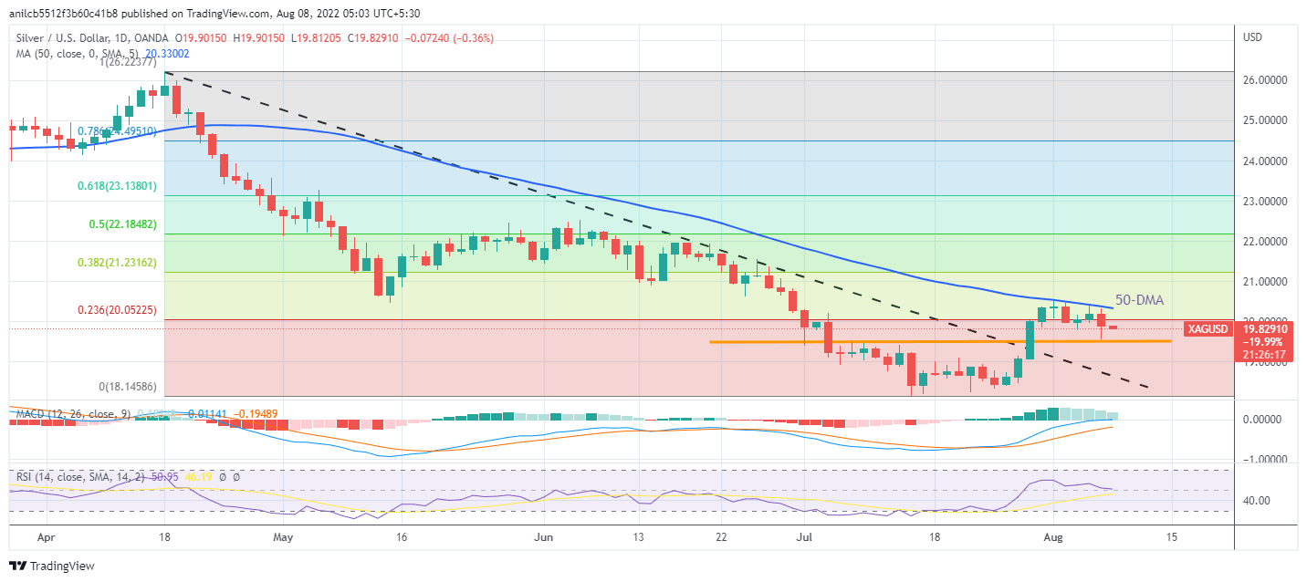 Silver price (XAG/USD) stays softer around $19.80, extending the previous week’s pullback from the 50-DMA amid Monday’s initial Asian session.