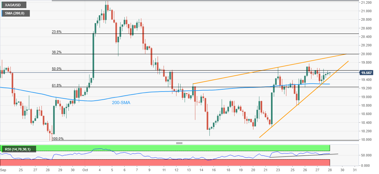 Alternatively, the downside break of the $19.45 level comprising the immediate support line, forming part of the rising wedge, could lure the XAG/USD bears to challenge the 200-SMA level near $19.30.