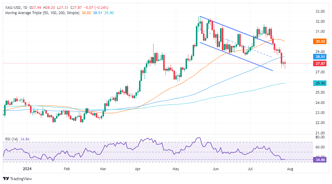 Silver's price tumbled below the 100-day moving average (DMA) at $28.49, opening the door for lower spot prices. Momentum is bearish, as depicted by the Relative Strength Index (RSI), an indication that the non-yielding metal could test lower prices.