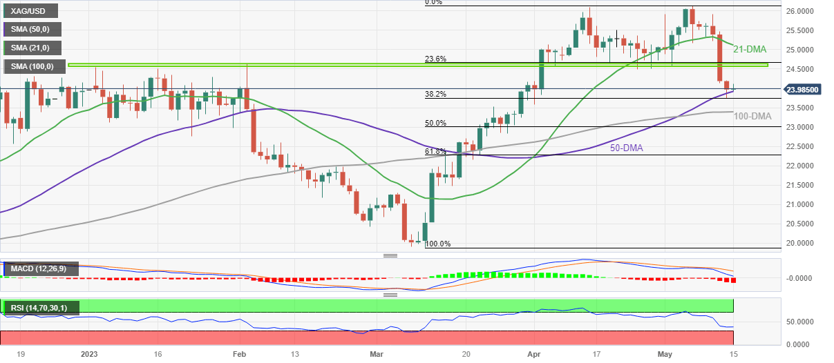 - Downbeat RSI (14) allows 50-DMA to challenge XAG/USD bears.